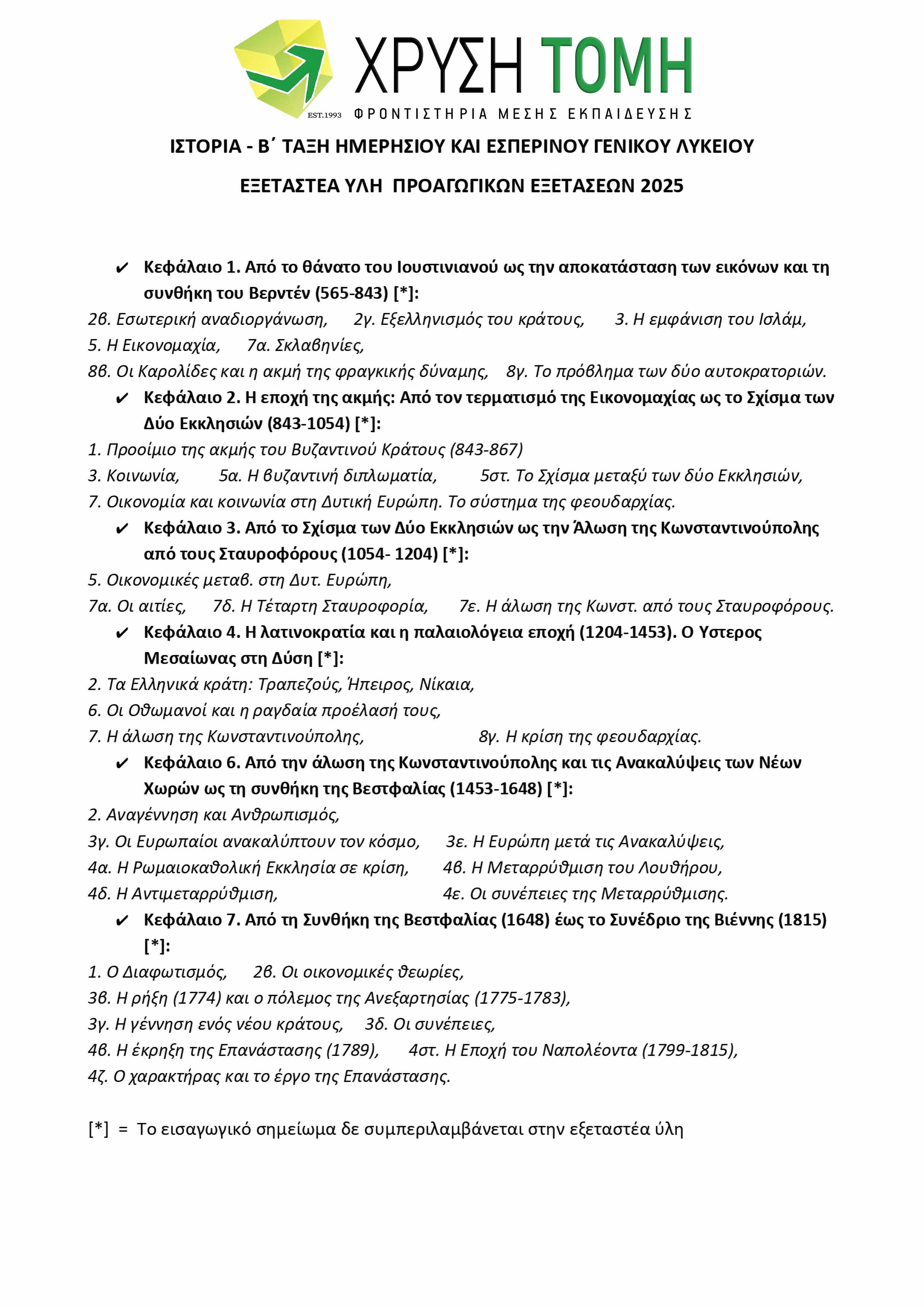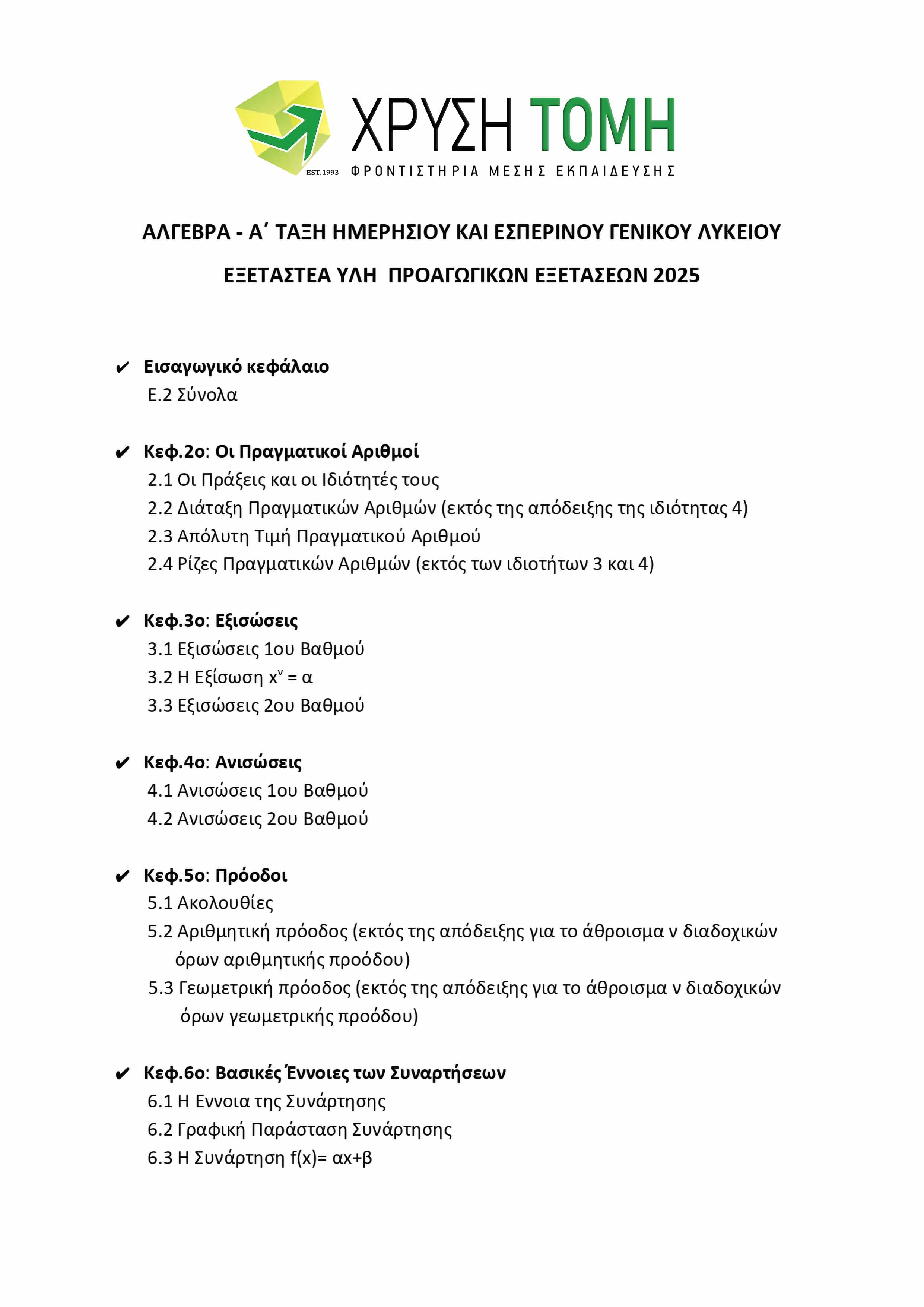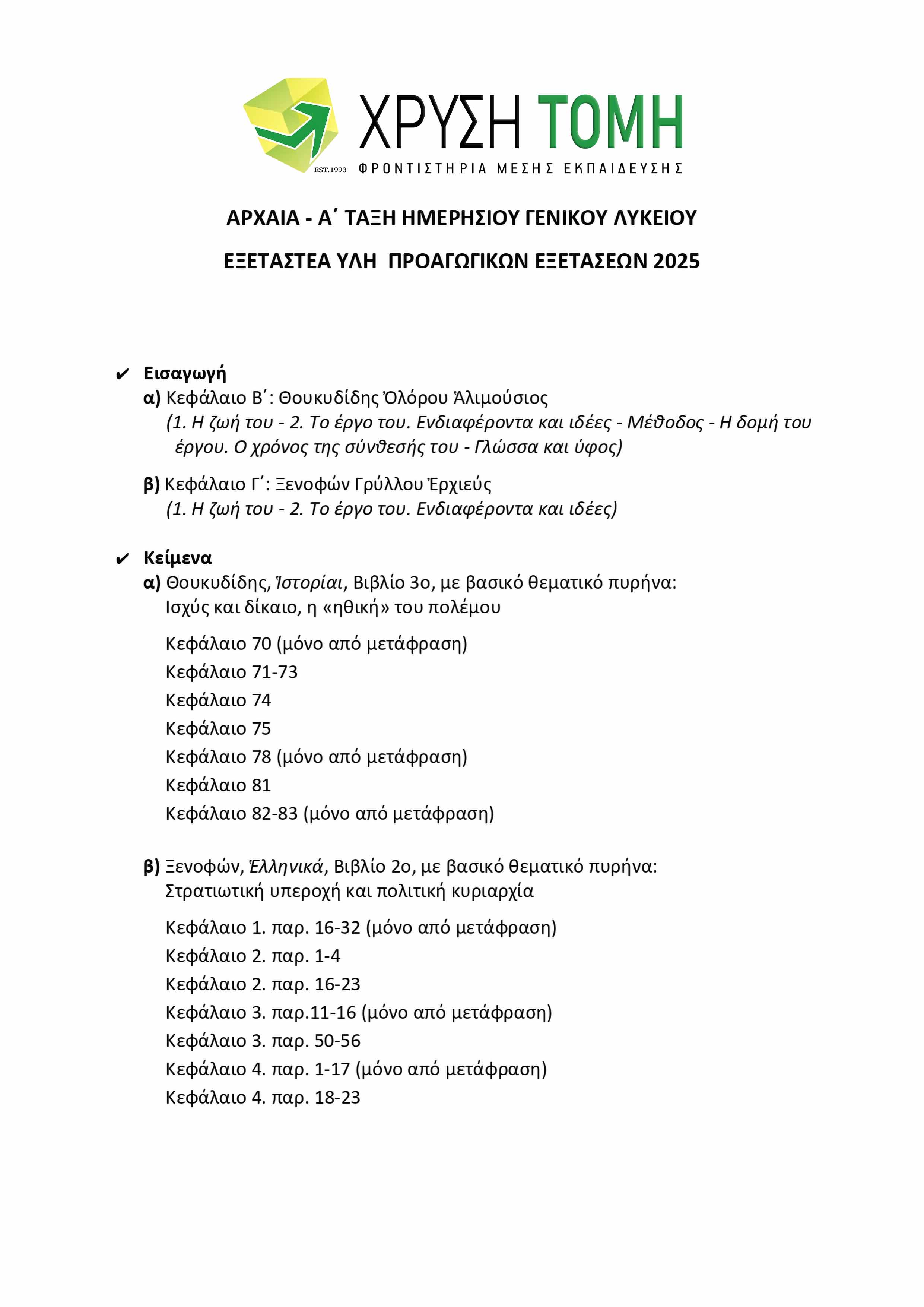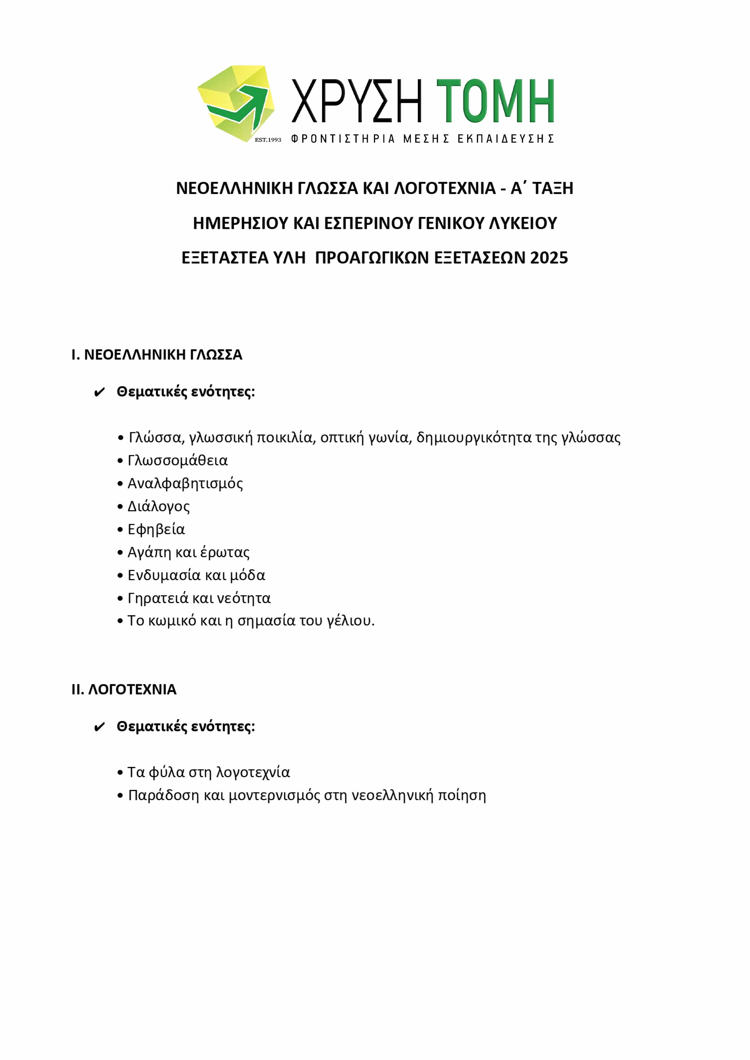 Το Φροντιστήριο Χρυσή Τομή παρουσιάζει την ύλη των 8 εξεταζόμενων μαθημάτων για τις Προαγωγικές Εξετάσεις 2025 στην Α΄ Τάξη Γενικού Λυκείου. Υπενθυμίζεται ότι στις τελικές εξετάσεις, το 50% των θεμάτων προέρχεται από την Τράπεζα Θεμάτων του Υπουργείου Παιδείας, με την επιλογή τους να πραγματοποιείται μέσω ηλεκτρονικής κλήρωσης την πρωινή ώρα της ημέρας διεξαγωγής κάθε εξέτασης.
