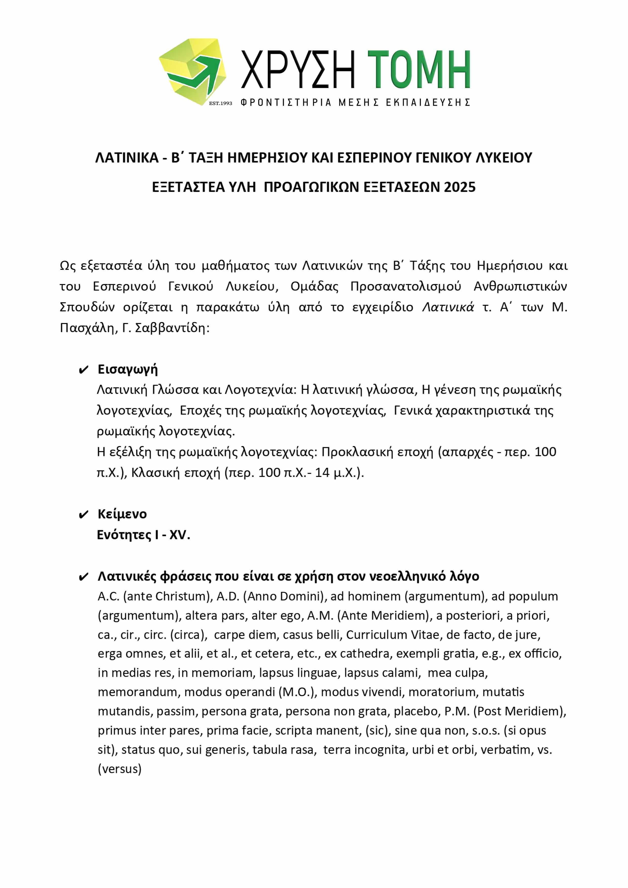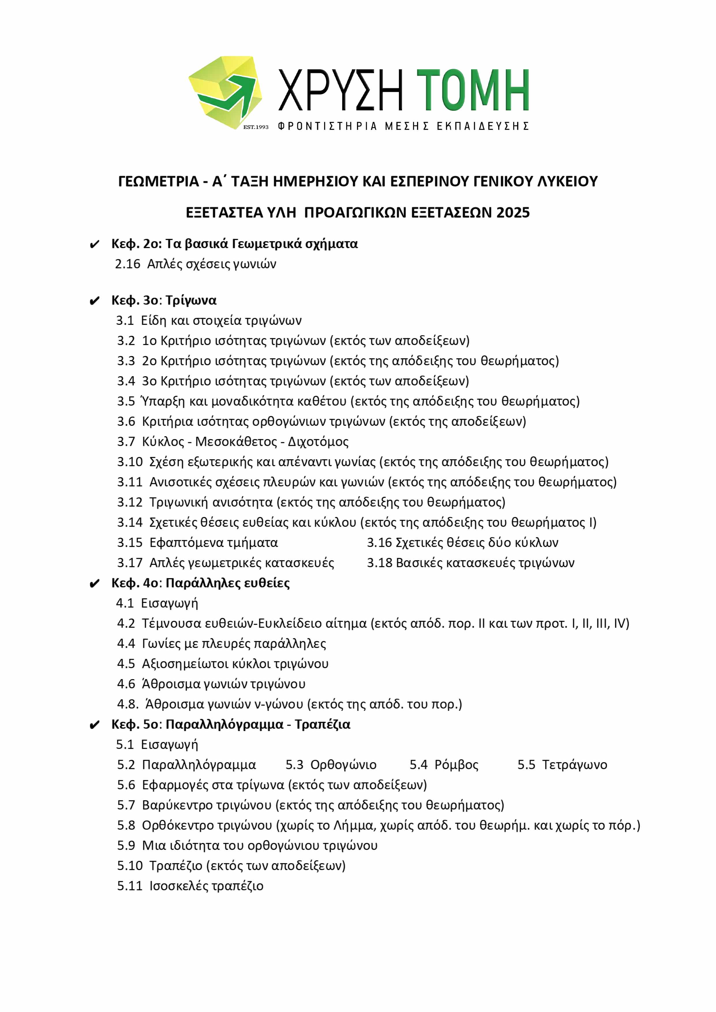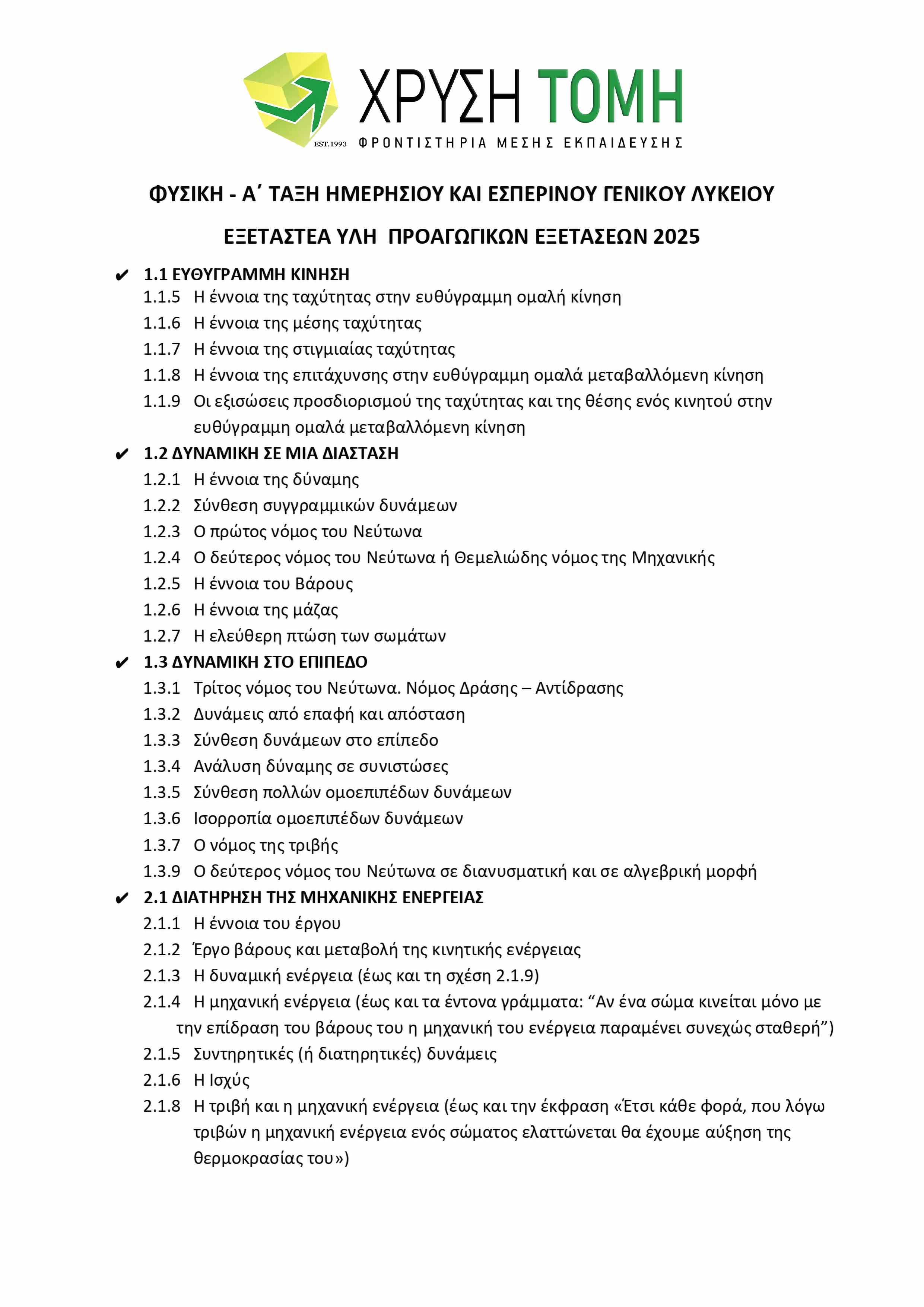Το Φροντιστήριο Χρυσή Τομή παρουσιάζει την ύλη των 8 εξεταζόμενων μαθημάτων για τις Προαγωγικές Εξετάσεις 2025 στην Α΄ Τάξη Γενικού Λυκείου. Υπενθυμίζεται ότι στις τελικές εξετάσεις, το 50% των θεμάτων προέρχεται από την Τράπεζα Θεμάτων του Υπουργείου Παιδείας, με την επιλογή τους να πραγματοποιείται μέσω ηλεκτρονικής κλήρωσης την πρωινή ώρα της ημέρας διεξαγωγής κάθε εξέτασης.