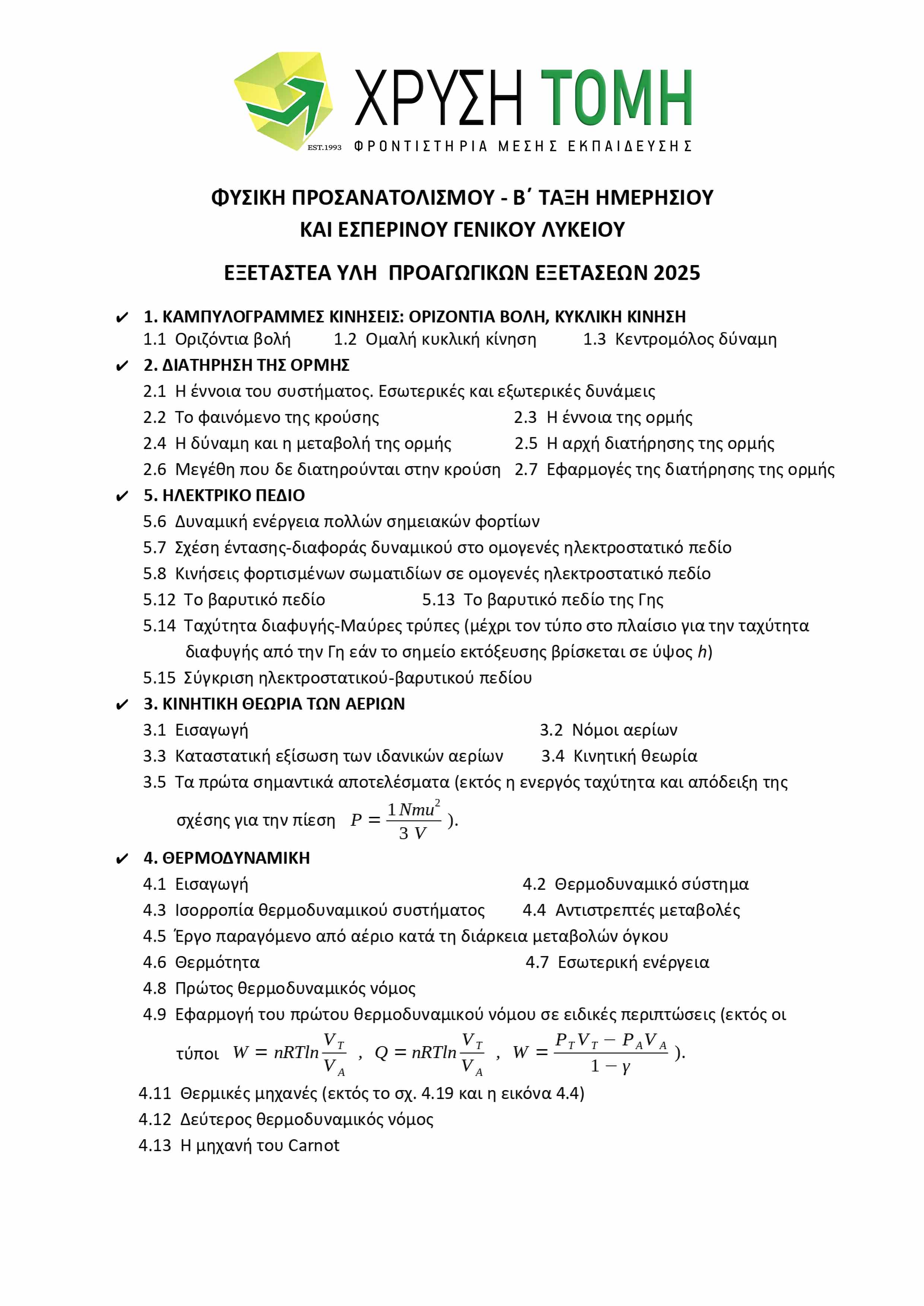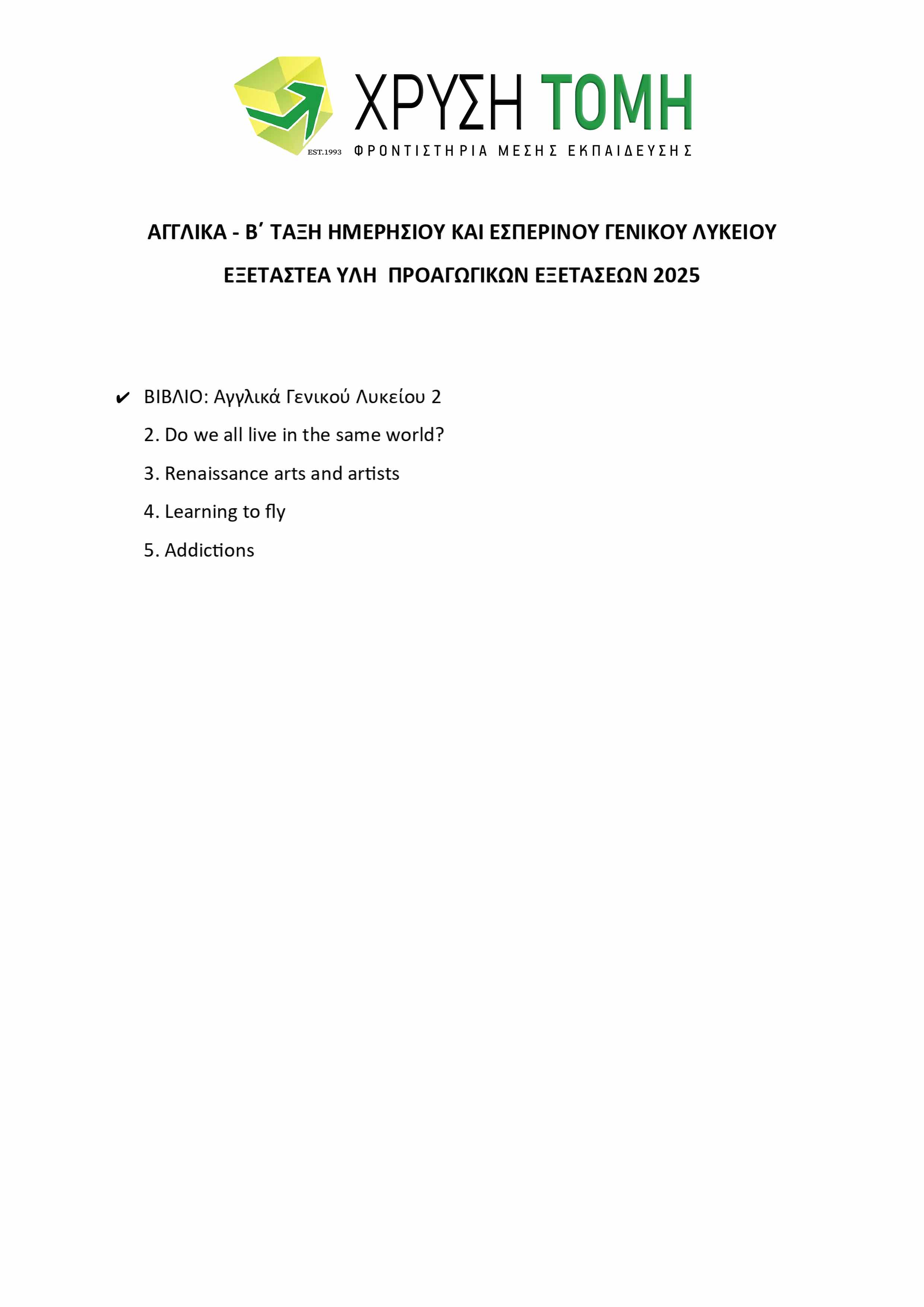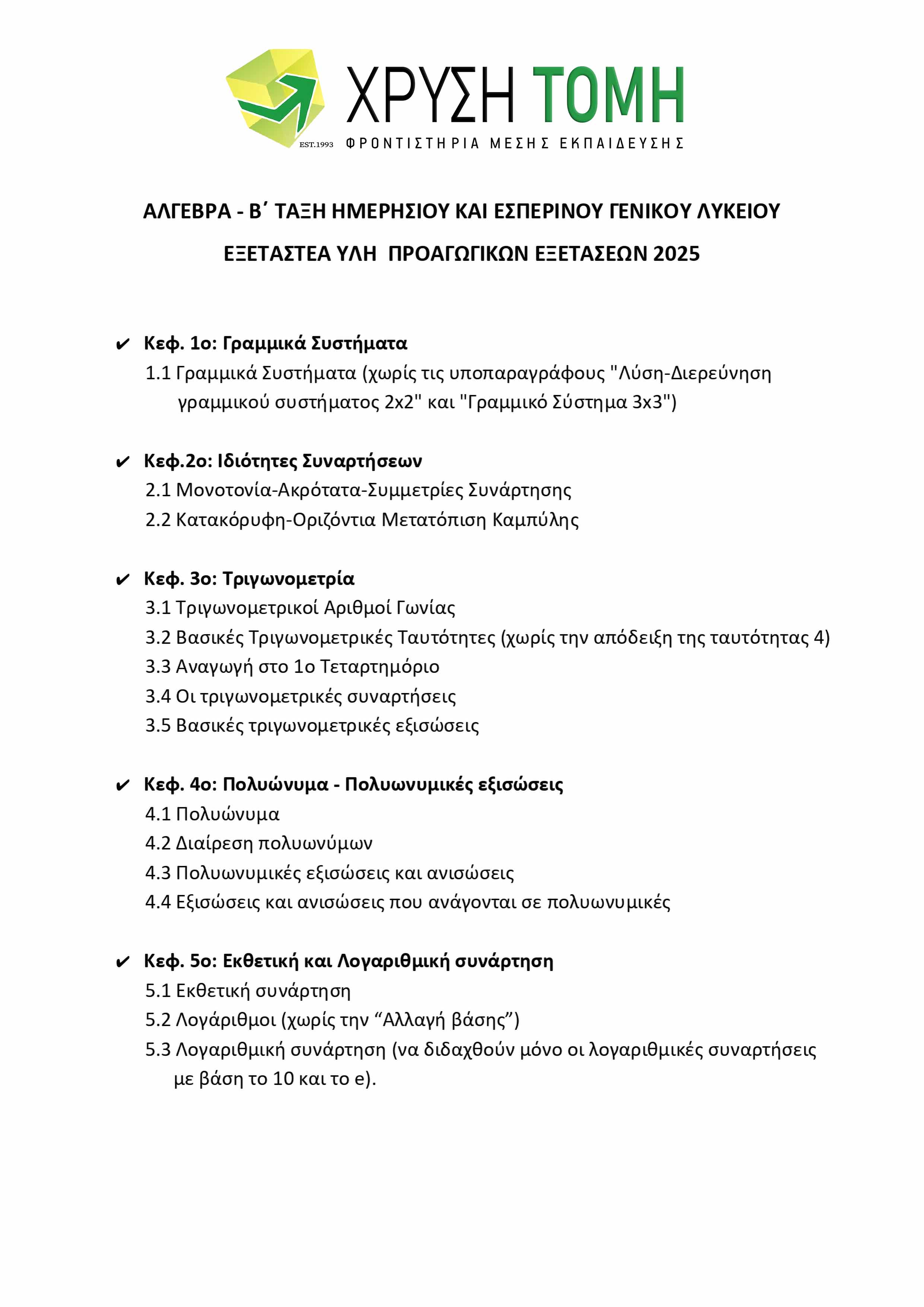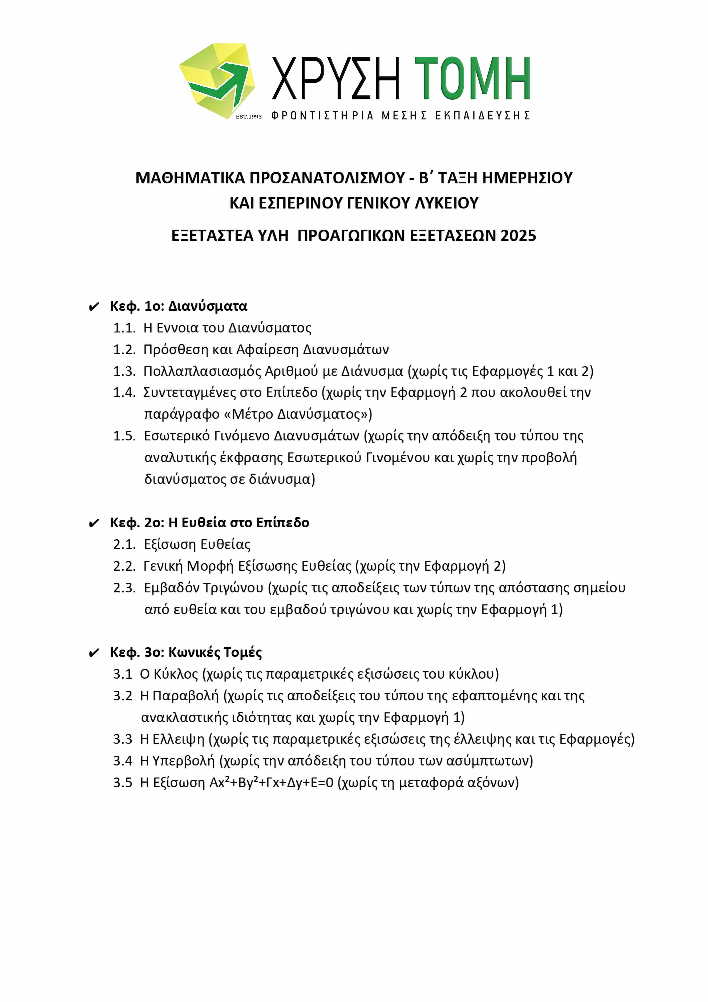 Το Φροντιστήριο Χρυσή Τομή παρουσιάζει την ύλη των 8 εξεταζόμενων μαθημάτων για τις Προαγωγικές Εξετάσεις 2025 στην Α΄ Τάξη Γενικού Λυκείου. Υπενθυμίζεται ότι στις τελικές εξετάσεις, το 50% των θεμάτων προέρχεται από την Τράπεζα Θεμάτων του Υπουργείου Παιδείας, με την επιλογή τους να πραγματοποιείται μέσω ηλεκτρονικής κλήρωσης την πρωινή ώρα της ημέρας διεξαγωγής κάθε εξέτασης.