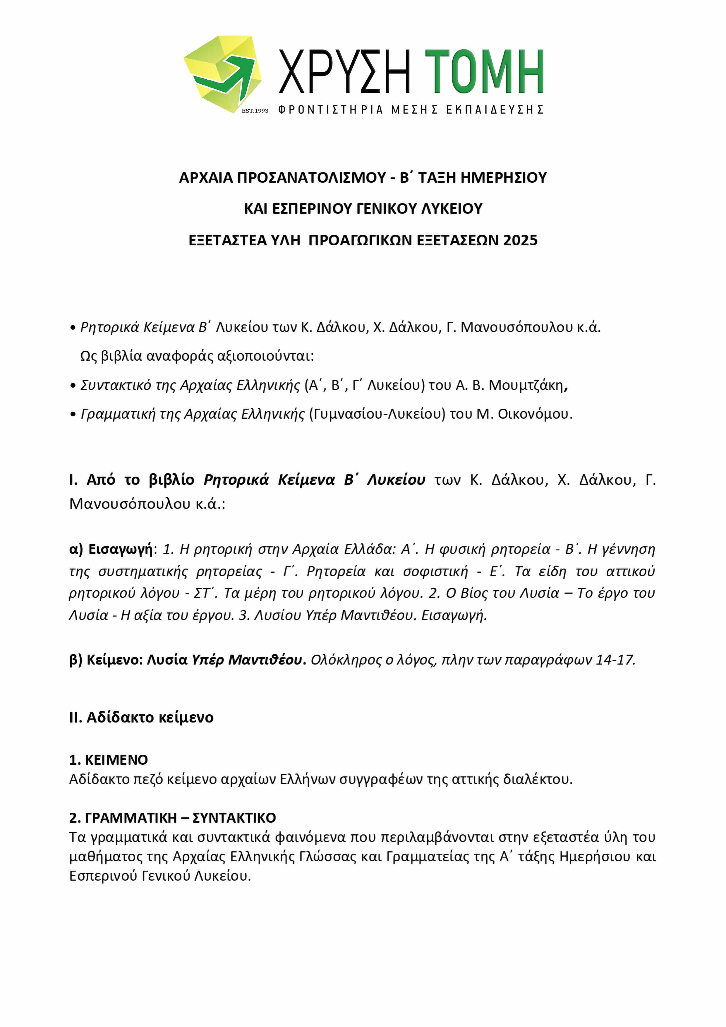 Εξεταστέα Ύλη Β΄ Λυκείου 2024 - 2025